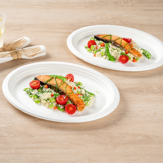 BAGASSE PLATE 10 X 8 INCH OVAL WHITE - CARTON OF 500 PCS