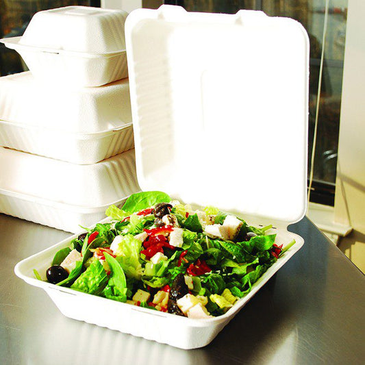 BAGASSE CLAMSHELL 9 X 9 INCH LUNCH BOX WHITE-CARTON OF 200 PCS